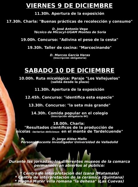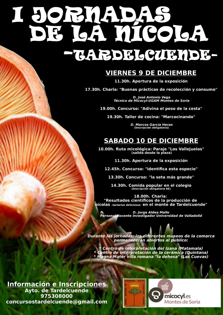 El Ayuntamiento de Tardelcuende con la colaboración de Micocyl-UGAM Montes de Soria organiza para los días 9 y 10 de diciembre las primeras Jornadas de la Nícola, que es como se conoce en esa zona a la seta Lactarius deliciosus. Para el desarrollo de las mismas tiene programadas numerosas actividades que tendrán como sede: