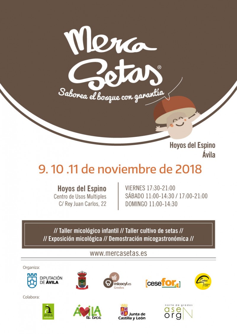 Esta edición de Mercasetas, la primera en la provincia de Ávila, ha sido organizada por la Diputación de Ávila, el Ayuntamiento de Hoyos del Espino, el Programa de Micología de Castilla y León (Micocyl), la Fundación Cesefor y la Marca de Garantía 'Setas de Castilla y León'. Las actividades previstas, que se detallan en el programa inferior, se llevarán a cabo en el marco de una pequeña feria con expositores del ámbito de la micología y productores pertenecientes a la marca colectiva 'Ávila Auténtica'.
