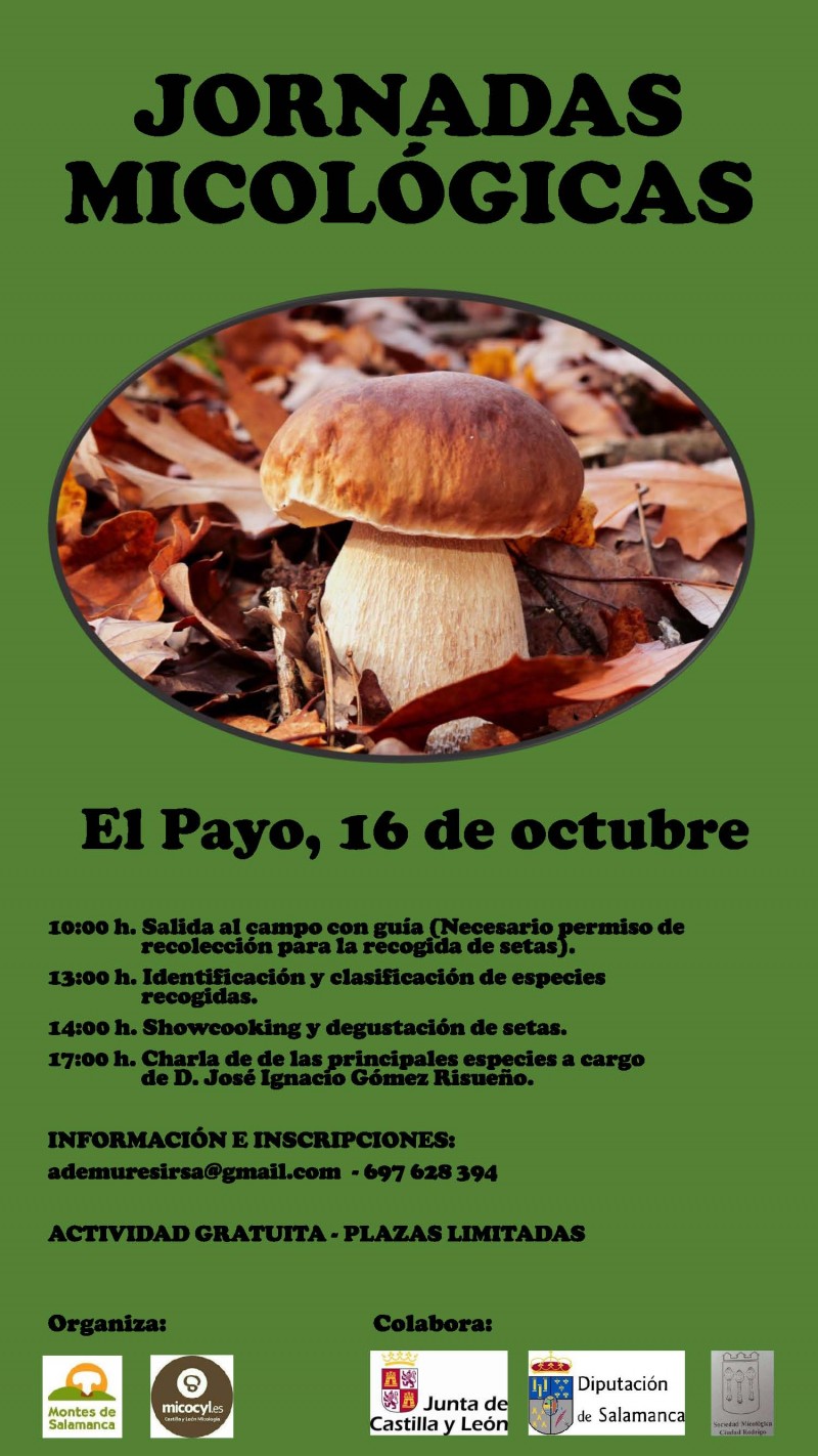 El sábado, 16 de octubre, el programa Micocyl, junto con la Asociación para el Desarrollo Sostenible de los Municipios de las Sierras de Francia, Béjar, Quilamas y El Rebollar, organiza unas Jornadas Micológicas en el municipio salamantino de El Payo, perteneciente al Parque Micológico "Sierras de Francia, Béjar, Quilamas y El Rebollar".