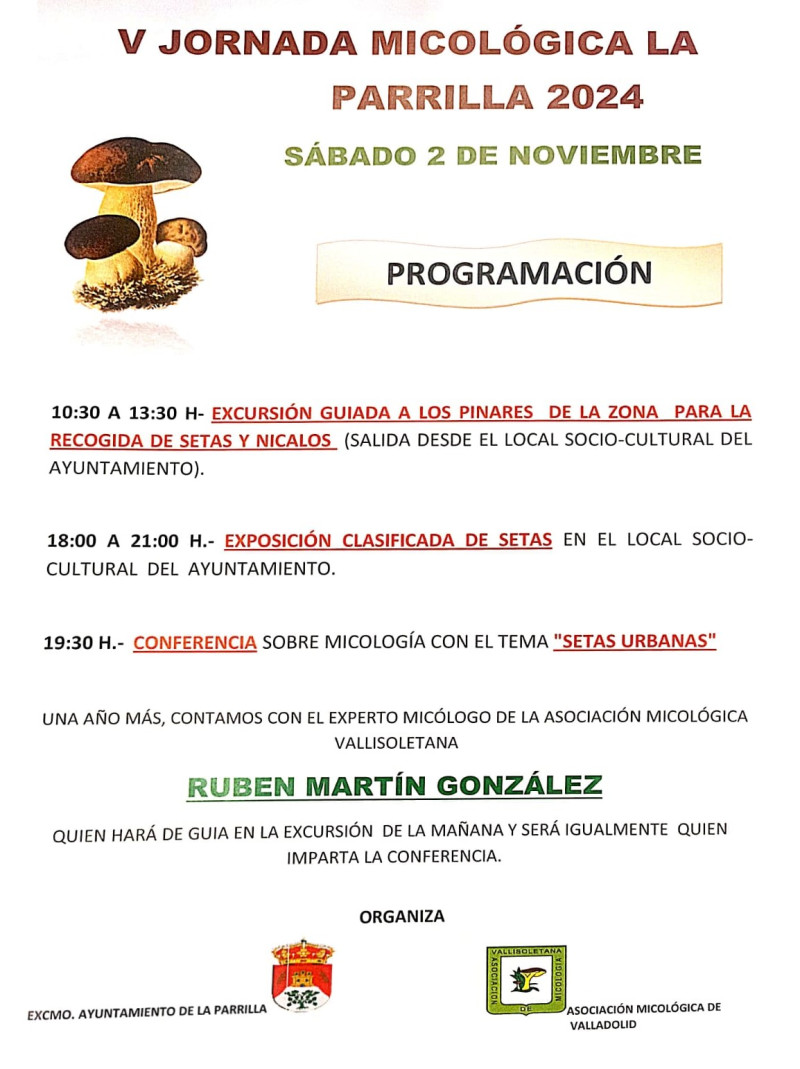 La actividad continuará por la tarde a las con una exposición de 18:00 a 21:00 horas y una charla impartida por Rubén Martín a las 19:30 horas, uno de los expertos más destacados de la Asociación Micológica Vallisoletana. Rubén compartirá conocimientos sobre las setas urbanas de la región, abordando temas de identificación, ecología y los usos de las especies recolectadas.