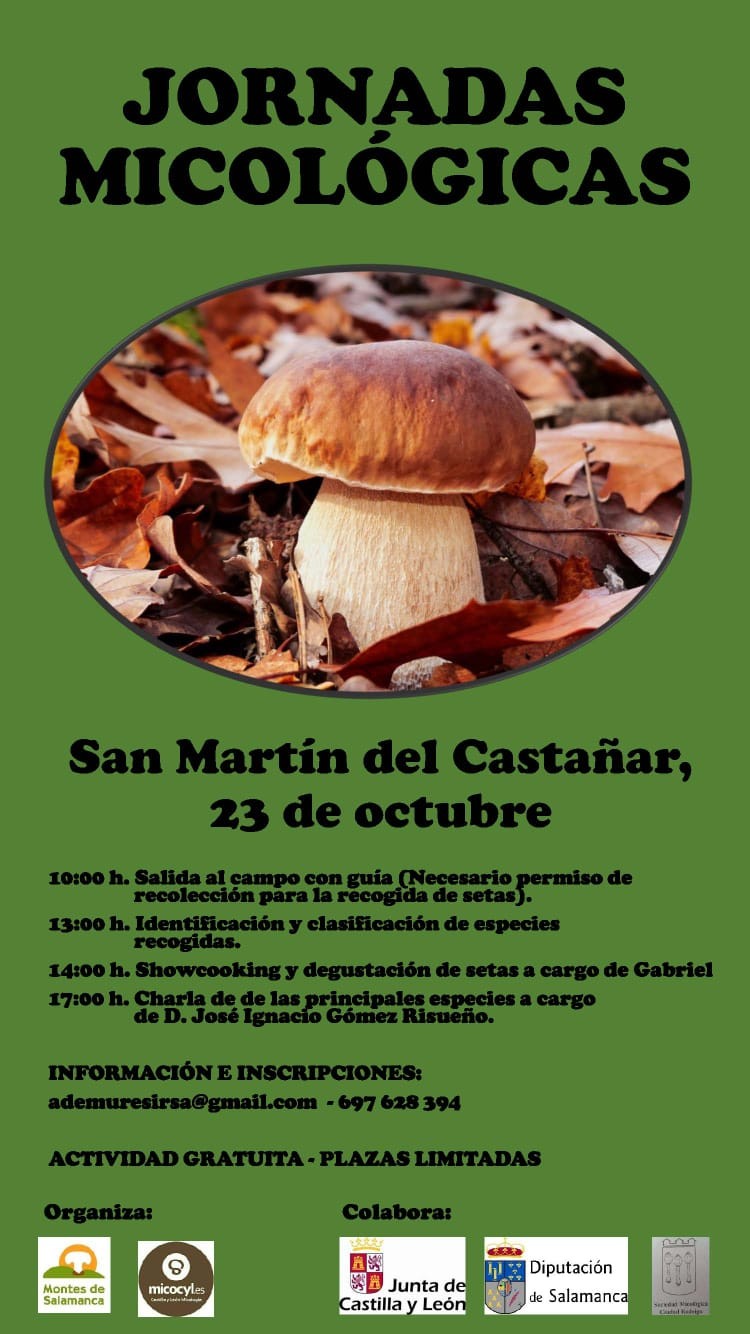 El sábado, 23 de octubre, el programa Micocyl, junto con la Asociación para el Desarrollo Sostenible de los Municipios de las Sierras de Francia, Béjar, Quilamas y El Rebollar, organiza unas Jornadas Micológicas en el municipio salamantino de San Martín del Castañar, perteneciente al Parque Micológico "Sierras de Francia, Béjar, Quilamas y El Rebollar".