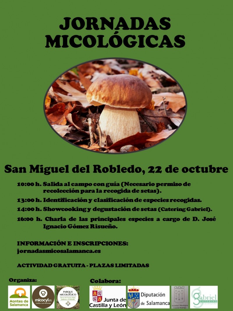 El sábado, 22 de octubre, el programa Micocyl, junto con la Asociación para el Desarrollo Sostenible de los Municipios de las Sierras de Francia, Béjar, Quilamas y El Rebollar, organiza unas Jornadas Micológicas en el municipio salmantino de San Miguel del Robledo, perteneciente al Parque Micológico "Sierras de Francia, Béjar, Quilamas y El Rebollar".