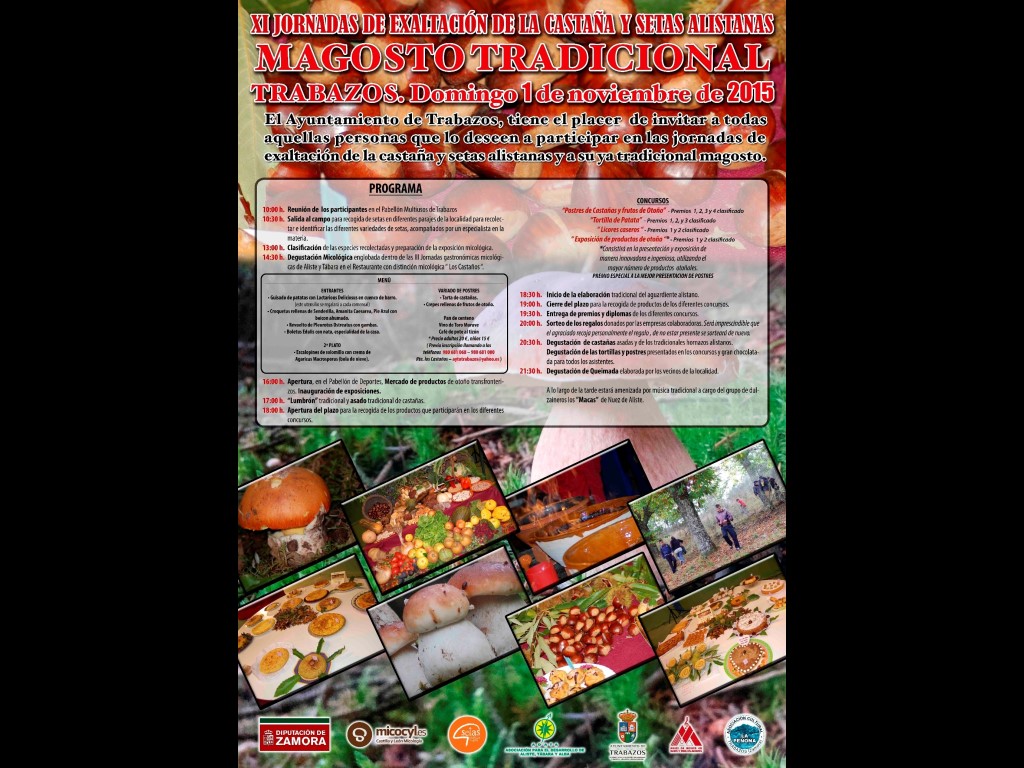 Disfruta el día 1 de Noviembre del tradicional Magosto en la localidad Zamorana de Trabazos. Podrás experimentar por medio de una ruta de campo, de los recursos que nos ofrece la naturaleza como son las setas, guiada con expertos en micología. Se hará posteriormente una clasificación de la setas recolectadas, y a las 14:30 horas degustación micológica en el restaurante "Los Castaños". Después de comer podrán dar un paseo por el mercado de productos de otoño transfronterizos.
