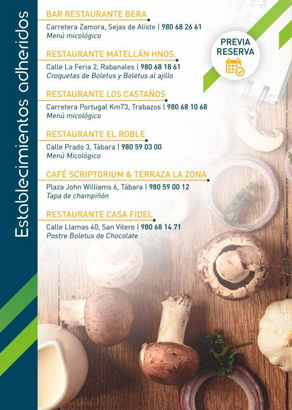 En Tábara, destacan el Restaurante El Roble, que sorprenderá a sus comensales con un Menú Micológico; el Café Scriptorium; Terraza La Zona, que ofrecerán deliciosas tapas de champiñón. Estos establecimientos se suman al Bar Restaurante Bera de Sejas de Aliste con su menú completo de setas, el Restaurante Matellán Hermanos de Rabanales de Aliste, que preparará Croquetas de Boletus y Boletus al ajillo, el Restaurante Los Castaños de Trabazos con otro Menú Micológico, y el Restaurante Casa Fidel de San Vitero, que deleitará con un original Postre Boletus de Chocolate.