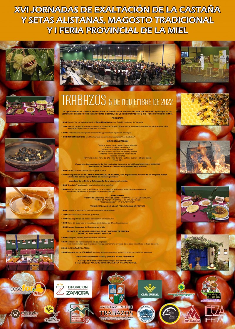 El 5 de noviembre tendrá lugar en Trabazos (Zamora) las XVL Jornadas de Exaltación de la Castaña y Setas Alistanas, Magosto Tradicional y I Feria Provincial de la Miel. Entre las muchas actividades del programa hay una ruta micológica guiada para identificar las diferentes setas que se encuentran en los montes del Parque Micológico Montes del Noroeste Zamorano y menús micológico en el restaurante Los Castaños Aquellas personas interesadas tienen que inscribirse previamente a través de los siguientes teléfonos: 980 681 068- 980 681 000 Para reservar la comida en el siguiente correo: hrestauranteloscastaños@gmail.com Más información en el programa adjunto: