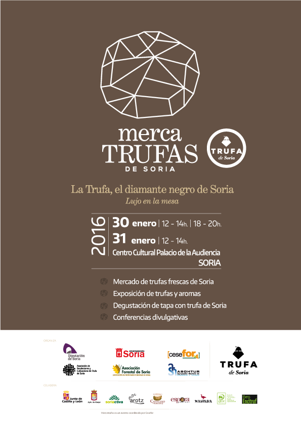 El Palacio de la Audiencia de la capital soriana acoge los días 30 y 31 de enero de 2016 la celebración de Mercatrufas, un mercado de vocación micoturística y punto de encuentro entre truficultores y consumidor final. Estos últimos -además de poder adquirir producto en freso- también tendrán la oportunidad de conocer diferentes especies de trufas, sus características y aromas gracias a una muestra divulgativa que se llevará a cabo en el mismo recinto. El folleto del programa de Mercatrufas estárá disponible próximamente aquí.