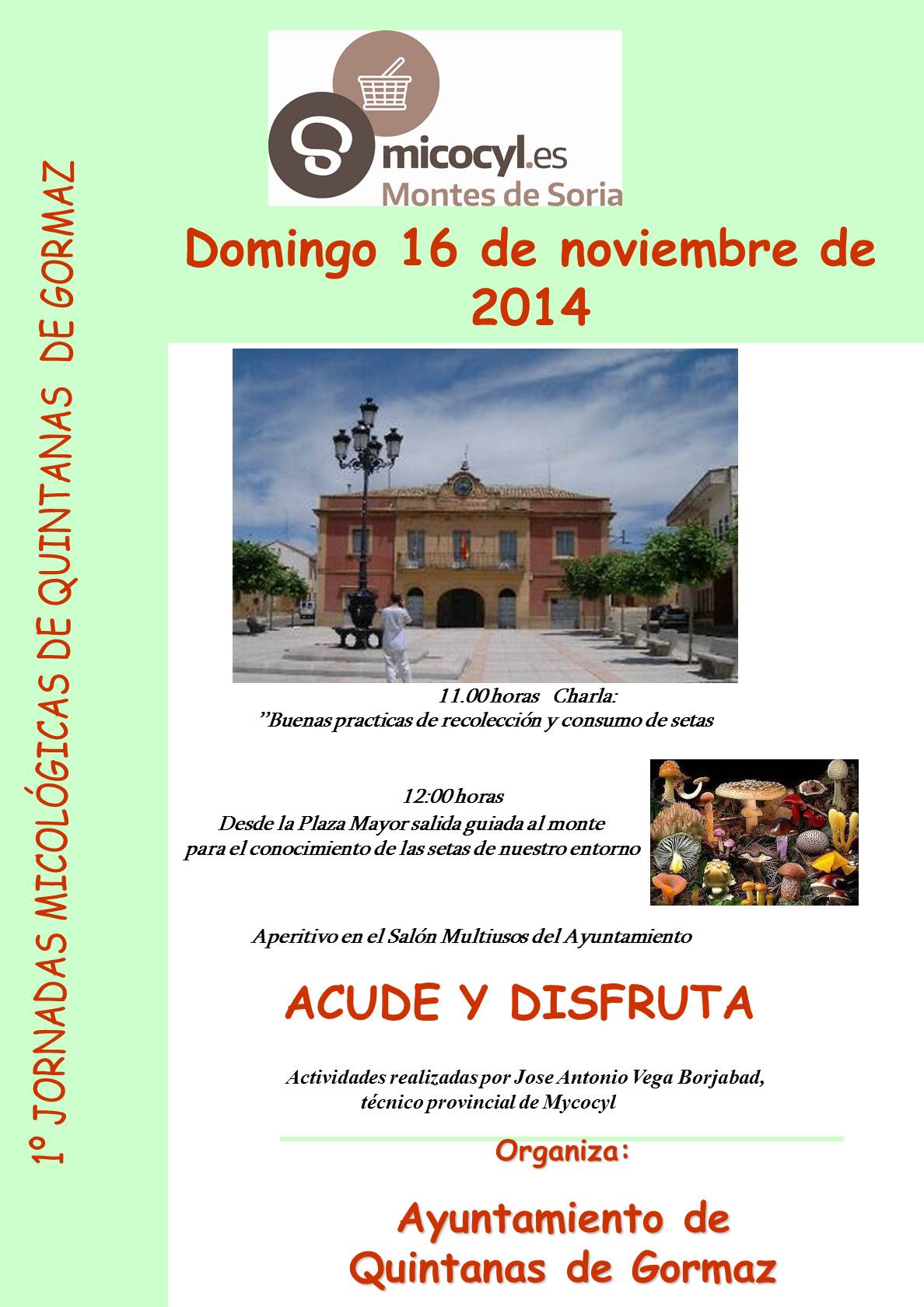 El Ayuntamiento de Quintanas de Gormaz organiza el domingo 16 de noviembre las Primeras Jornadas Micológicas de la localidad, que arrancan a las 11.00 horas con la charla 'Buenas prácticas de recolección y consumo de setas', a cargo del técnico de Micocyl en Soria, José Antonio Vega Borjabad, quien al finalizar la conferencia realizará una visita guiada al monte con todos los interesados en conocer las setas y hongos del entorno. Hacia al mediodía el Ayuntamiento ofrecerá un aperitivo en la sala de usos múltiples de la Casa Consistorial.