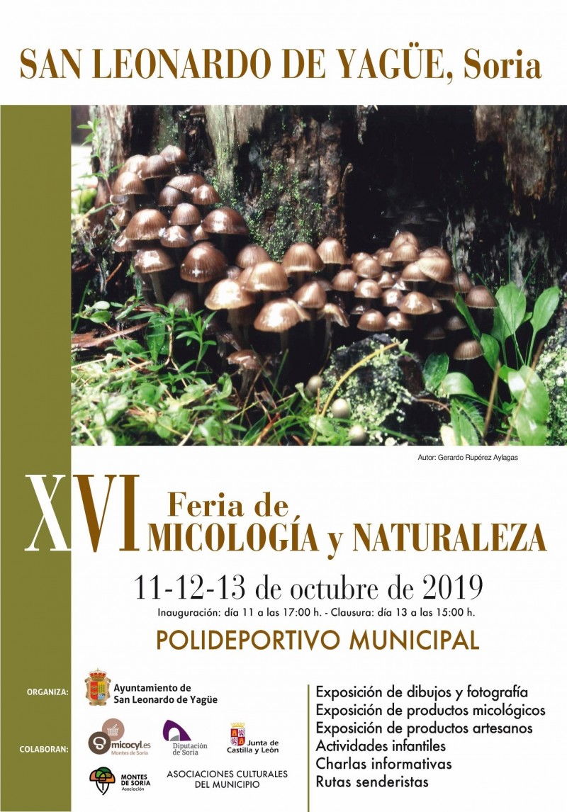 El Ayuntamiento de San Leonardo en colaboración con la Asociación Montes de Soria y otras entidades, organizan la decimosexta edición de la Feria de Micología y Naturaleza durante los días 11, 12 y 13 de octubre de 2019. Durante el fin de semana habrá numerosas actividades para todo tipo de público. Los espacios principales serán el pabellón muicipal, el teatro, el colegio e instituto. Posteriormente se facilitará más información concreta del programa de actividades a desarrollar.