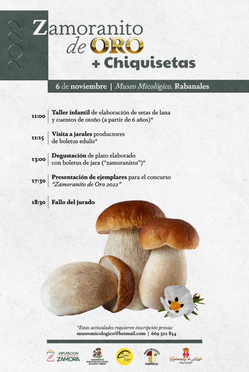 Este domingo 6 de noviembre tendrá lugar el Zamoranito de Oro, junto con el Chiquisetas en el Museo Micológico de Rabanales (Zamora). La jornada irá acompañada de actividades para todas las edades, con taller infantil de lana y cuentacuentos, visita a los jarales de la zona, comida micológica y, para rematar, el Zamoranito de Oro al final de la jornada, el concurso al mejor Boletus edulis de jara.