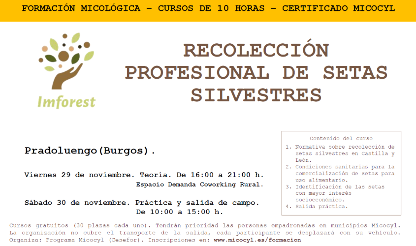 Durante los días 29 y 30 de noviembre se ha programado en Pradoluengo (Burgos) un curso sobre recolección profesional de setas silvestres a través del Programa Micocyl y el proyecto IMFOREST.