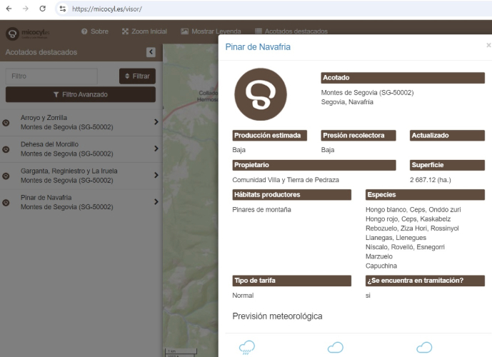 Además, al hacer clic en un monte específico, se obtienen datos relevantes del monte acotado, como: nombre del monte, acotado al que pertenece, presión recolectora, producción estimada, propietario, superficie, hábitats, especies significantes en la zona como boletus, níscalos, rebozuelos, capuchinas, setas de cardo…tarifas de permisos de recolección e incluso la previsión meteorológica para los próximos días.