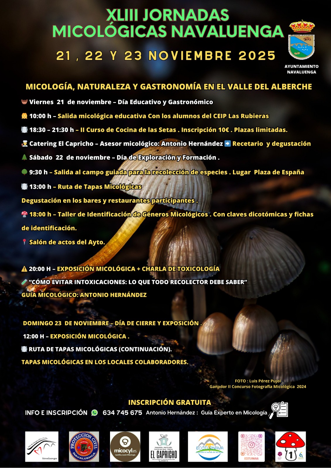 • El sábado 22 de noviembre está dedicado a la exploración y formación: a las 9:30 habrá una salida para recolectar setas desde la Plaza de España, seguida a las 13:30 por una ruta de tapas micológicas por los establecimientos locales. Ya por la tarde, a las 18:00, se realizará un taller de identificación de hongos, y a las 20:00 se abrirá la exposición micológica. La jornada culminará con una conferencia a las 20:30 titulada “Cómo evitar intoxicaciones: lo que todo recolector debe saber”, dirigida por el micólogo Antonio Hernández.