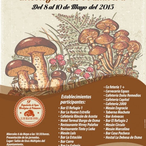 La villa episcopal soriana de El Burgo de Osma, organiza los días 8 , 9 y 10 de mayo de 2015 la novena edición de la Degustación de Tapas Micológicas de Primavera en la que participarán 23 establecimientos hosteleros de la localidad.