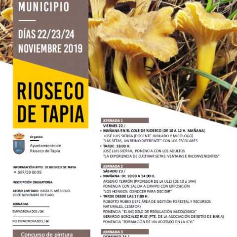 Rioseco de Tapia prepara el II Encuentro Micológico que, según lo previsto, se celebrará los días 22, 23 y 24 de noviembre. Los actos programados comenzarán este viernes por la mañana en el colegio de Rioseco, en horario de 10:00 a 12:00 horas, con el docente jubilado y micólogo José Luis Sierra que hablará a los escolares sobre ‘Las setas, un reino diferente’. En horario de tarde, a las 18:00 horas, el mismo ponente hablará sobre la experiencia de cultivar setas, ventajas e inconvenientes.