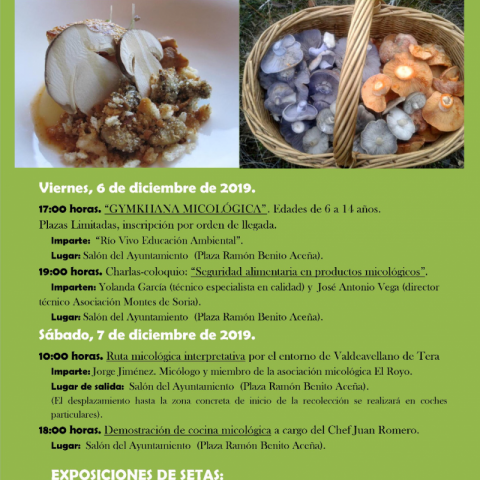 La Asociación Cultural de Valdeavellano de Tera y la Asociación Montes de Soria organizan la tercera edición de las JORNADAS MICOLÓGICAS EN VALDEAVELLANO DE TERA los días 6 y 7 de diciembre de 2019. Colaboran el Ayuntamiento de la localidad y la Diputación Provincial de Soria. El programa de actividades incluye desde salida al campo, taller de cocina, exposiciones, photocall micológico, actividades para los más pequeños,..... os esperamos!!!!!!!!!!!!