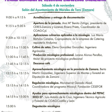 La jornada se desarrollará en el salón del Ayuntamiento de Morales de Toro y se extenderá desde las 9 de la mañana hasta las 3 de la tarde. El programa diseñado para este día es muy completo e incluye diversos aspectos relacionados con la profesionalización de la actividad micológica. Los temas a tratar abarcan el cultivo y las aplicaciones culinarias de las setas, la producción micológica profesional, la regulación micológica y las ayudas disponibles para el aprovechamiento micológico con los nuevos fondos de la PAC para el periodo 2023-27.