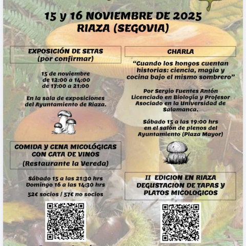 Organizadas por la Asociación Micológica Villa de Riaza, con la colaboración del Ayuntamiento de Riaza y los bares y restaurantes locales, estas jornadas combinan la divulgación científica con una exquisita oferta gastronómica en torno a las setas silvestres de la comarca.