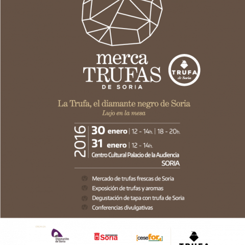 El Palacio de la Audiencia de la capital soriana acoge los días 30 y 31 de enero de 2016 la celebración de Mercatrufas, un mercado de vocación micoturística y punto de encuentro entre truficultores y consumidor final. Estos últimos -además de poder adquirir producto en freso- también tendrán la oportunidad de conocer diferentes especies de trufas, sus características y aromas gracias a una muestra divulgativa que se llevará a cabo en el mismo recinto. El folleto del programa de Mercatrufas estárá disponible próximamente aquí.