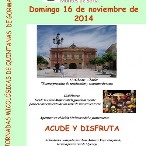 El Ayuntamiento de Quintanas de Gormaz organiza el domingo 16 de noviembre las Primeras Jornadas Micológicas de la localidad, que arrancan a las 11.00 horas con la charla 'Buenas prácticas de recolección y consumo de setas', a cargo del técnico de Micocyl en Soria, José Antonio Vega Borjabad, quien al finalizar la conferencia realizará una visita guiada al monte con todos los interesados en conocer las setas y hongos del entorno. Hacia al mediodía el Ayuntamiento ofrecerá un aperitivo en la sala de usos múltiples de la Casa Consistorial.