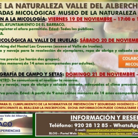 9:30-13:30 Salida Micológica de Campo al Valle Iruelas: Recoleción de muestras. Nociones básicas para la recolección de las setas. Recolección de ejemplares para su identificación y estudio.