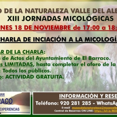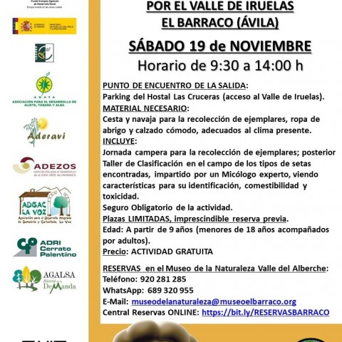 9:30-13:30 Salida Micológica de Campo al Valle Iruelas: Recoleción de muestras. Nociones básicas para la recolección de las setas. Recolección de ejemplares para su identificación y estudio.